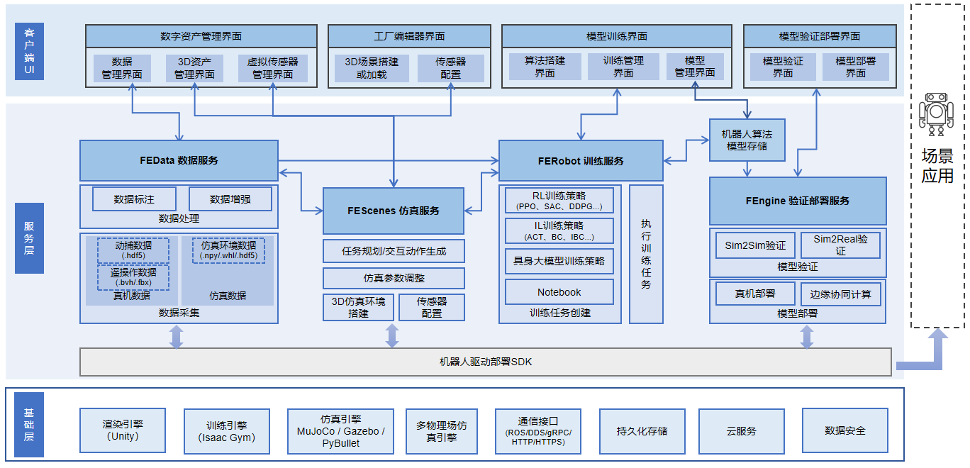 2. FEden 仿真训练平台:国内首个工厂级具身智能训练道场,涵盖 FEData 数据服务、FEScenes3D 工厂建模、FERobot 具身大小脑训练、FEngine 验证部署四大核心模块,提供数据采集 / 标注 / 增强、3D 高保真场景搭建、具身智能算法训练、模型验证与一键部署等全链路能力。