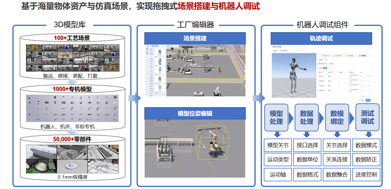 1) FEScenes(3D 工厂建模工具):提供 3D 模型资产库、工厂编辑器、机器人调试组件,支持规范化资产模型导入与管理,快速搭建高保真 3D 虚拟工厂。