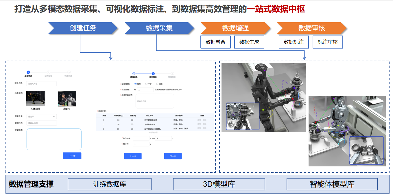 (2) 打造一站式数据中枢,支持仿真、真机、动捕等多源数据采集、标注、增强,破解科研训练数据匮乏难题;