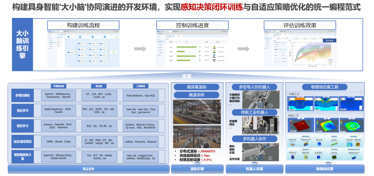 (2) 提供 “大小脑” 协同训练能力,支撑任务规划、语义理解、推理决策(具身大脑)与精准运动控制、工艺操作(具身小脑)的协同算法研发;
