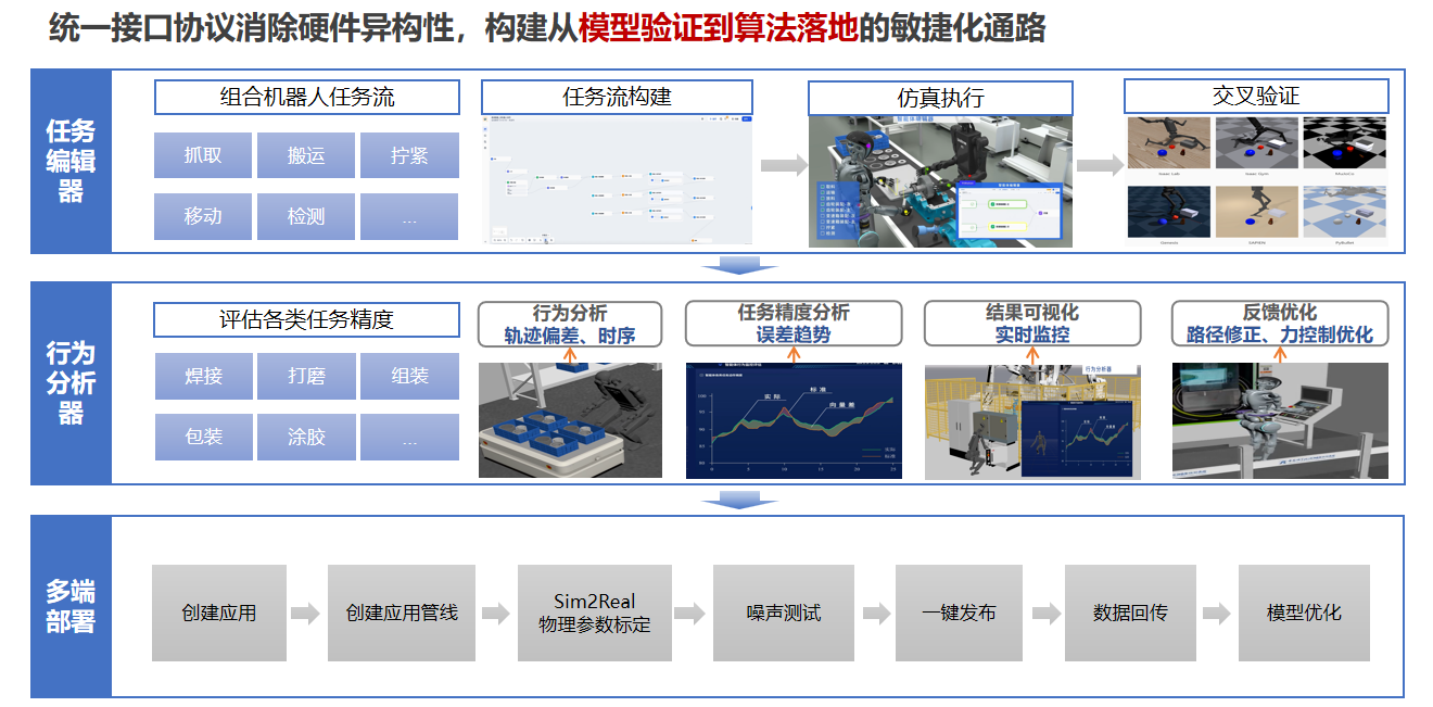 3. 端侧仿真协同,全链路高效落地:构建 “虚拟仿真 - 模型训练 - 验证优化 - 真机部署” 的全流程开发体系,Sim2Real 跨域验证保障虚拟训练模型向真机的高效迁移,统一接口协议消除硬件异构性,实现模型快速上线与作业落地,大幅缩短工业机器人开发与应用周期。