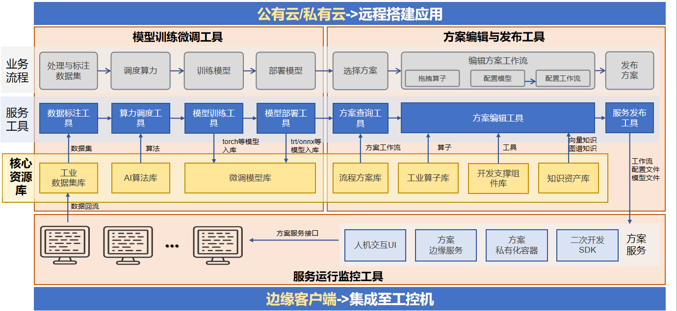 4. 核心创新:首次提出并实现了面向复杂工业场景的 “数据采集 - 智能标注 - 自动化训练 - 云边协同部署 - 数据回流优化” 的全流程闭环,解决了工业 AI 应用落地 “技术门槛高、训练成本高、开发效率低” 的三大痛点。