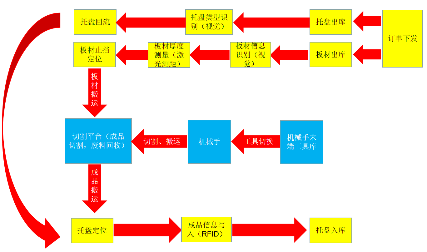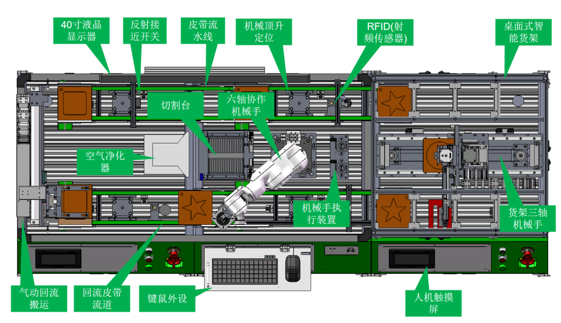平台须包含单元底座,皮带循环线、气动回流搬运、智能仓库、协作机器人、机械手气动快换工具(包含切割和搬运)、检测视觉、厚度测量、板材切割载台(包含废料回收)、空气净化、RFID信息读写等模块,组成一条完整的包含出库、来料、组装、检测、入库的自动化、数字化生产线体。