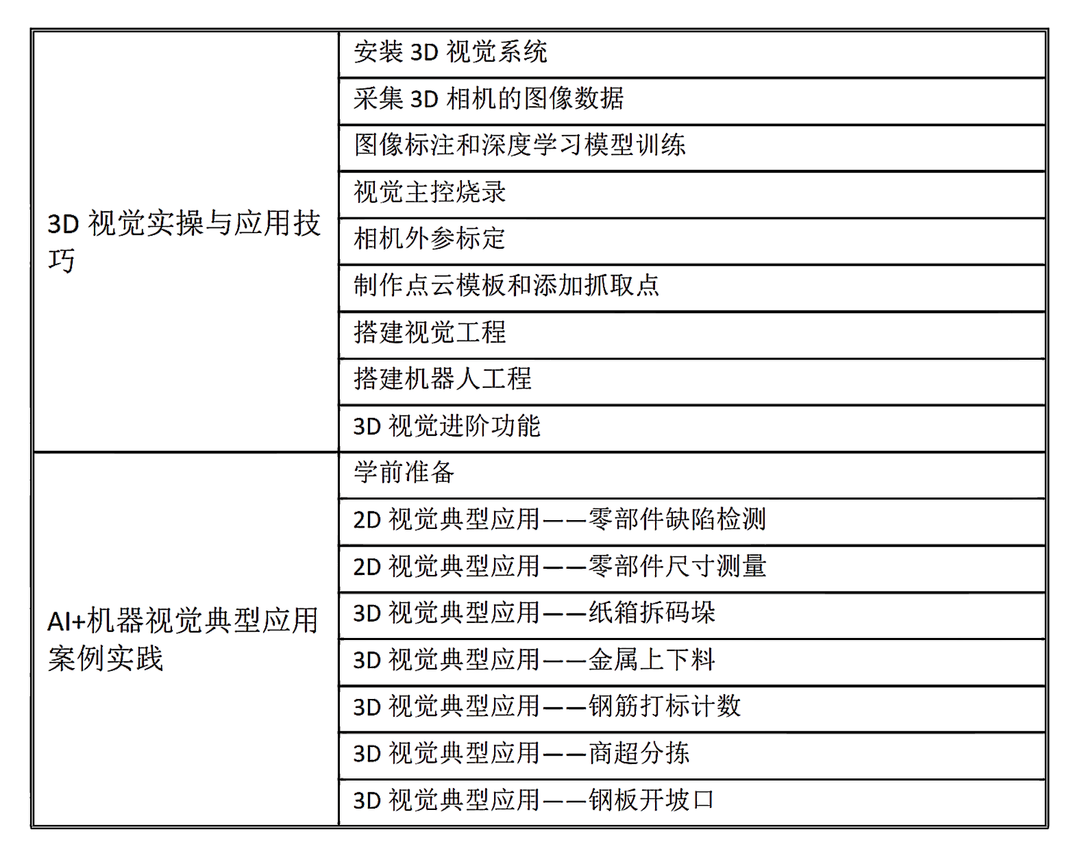 供配套完善的实训教材与培训视频,能满足视觉算法,软件,机械,电气以及机器人相关专业的学员,开展机器人从基础示教、离线编程、到复杂视觉应用开发等知识点的实验实训。