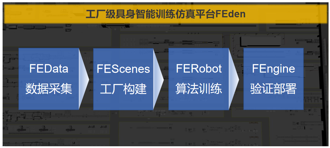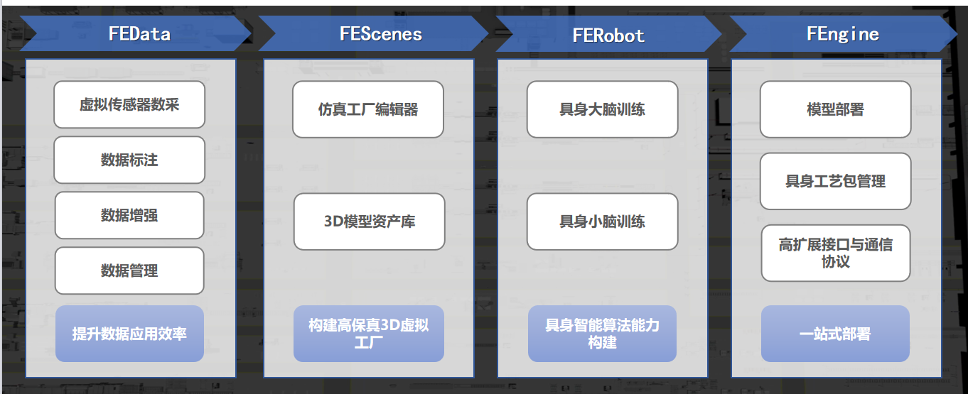 2. FEden 仿真训练平台:国内首个工厂级具身智能训练道场,涵盖 FEData 数据服务、FEScenes3D 工厂建模、FERobot 具身大小脑训练、FEngine 验证部署四大核心模块,提供数据采集 / 标注 / 增强、3D 高保真场景搭建、具身智能算法训练、模型验证与一键部署等全链路能力。