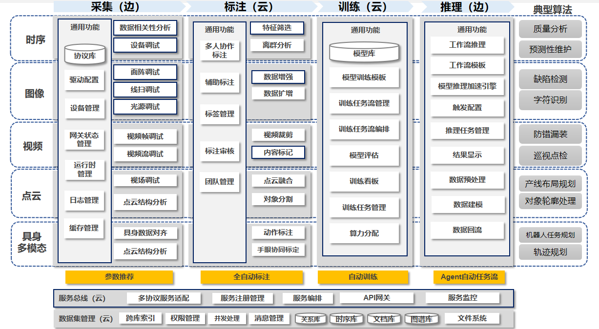 (1) 多模态数据支持:全面支持工业场景下的图像、视频、三维点云、时序信号(如传感器数据)及具身智能数据的融合采集与处理。